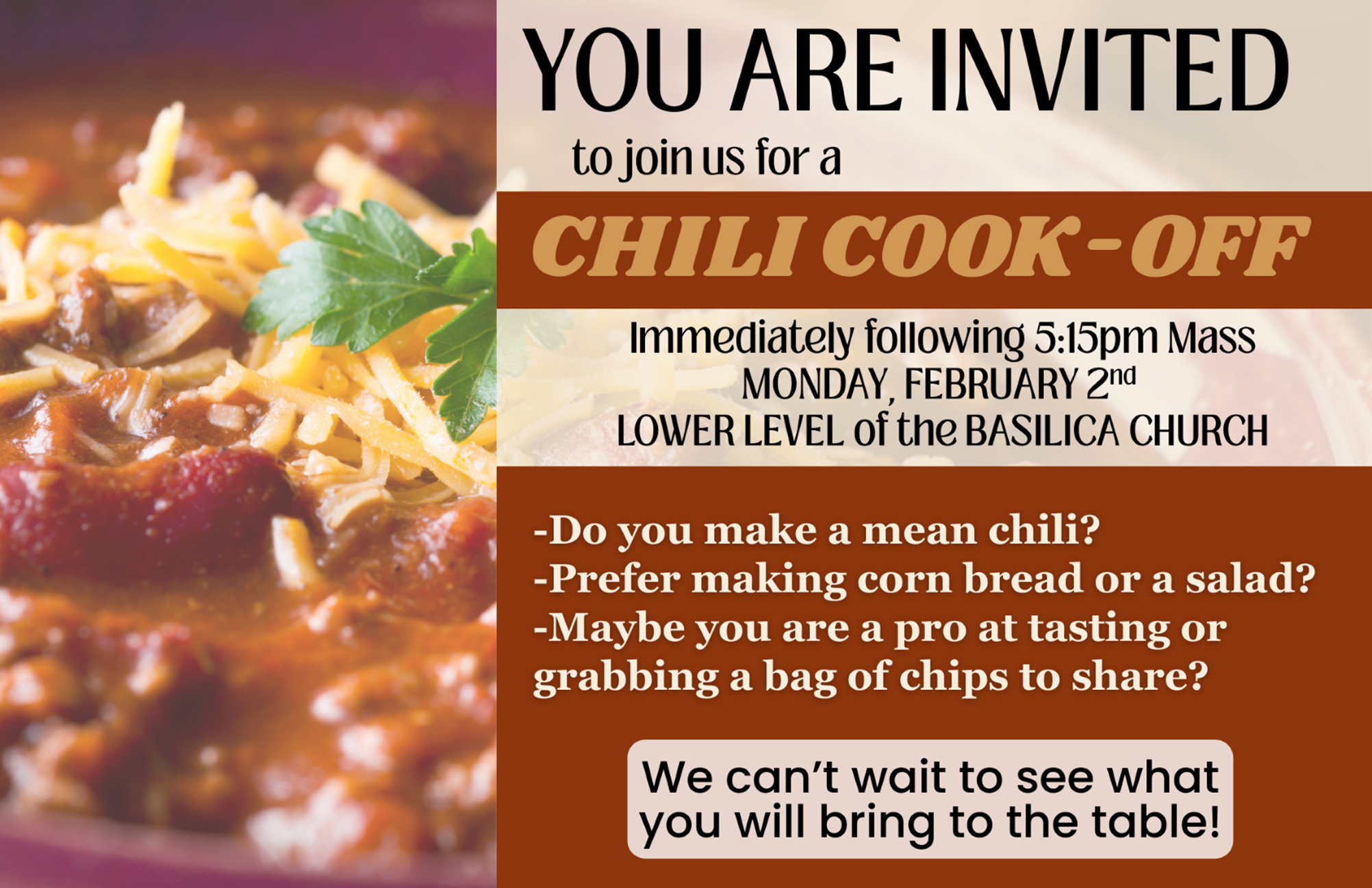 Join us after 5:15pm Mass on Monday, February 2nd for a Chili Cook-Off in the lower level of the Basilica Church. The d...